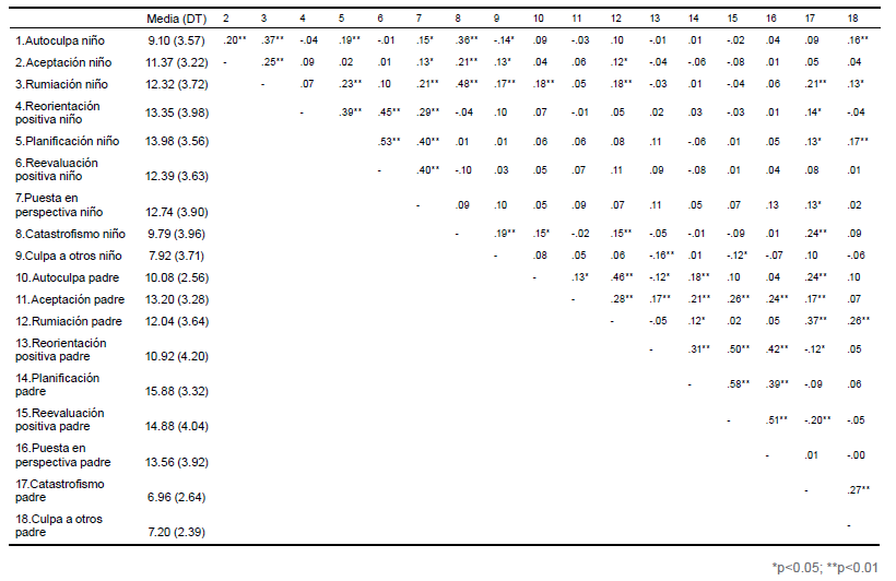 En la muestra de padres, las puntuaciones más bajas en variables de regulación emocional se observan en el caso de catastrofismo, culpa a otros y autoculpa, coincidiendo con la tendencia observada en los niños.