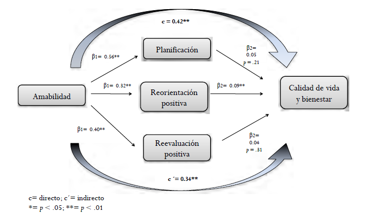 Con respecto al modelo M1, los efectos indirectos al primer mediador son todos significativos y son aquellos que parten de la variable de personalidad amabilidad hacia las estrategias de regulación emocional en niños: planificación (β1 = .5602; p = .0001); reorientación positiva (β1 = .3248; p = .0016 y; reevaluación positiva (β1 = .4070; p = .0001). La regresión de las estrategias de regulación emocional sobre la calidad de vida en niños aporta los siguientes coeficientes: planificación (β2 = . 0528; p = . 2029); r eorientación p ositiva ( β2 = .0909; p = .0076 y; reevaluación positiva (β2 = .0407; p = .3144), siendo significativa solamente la relación entre reorientación positiva y calidad de vida. Observamos una mediación parcial del efecto directo: c =.4210 p = .0001; c’ = .3454 p = .0001.