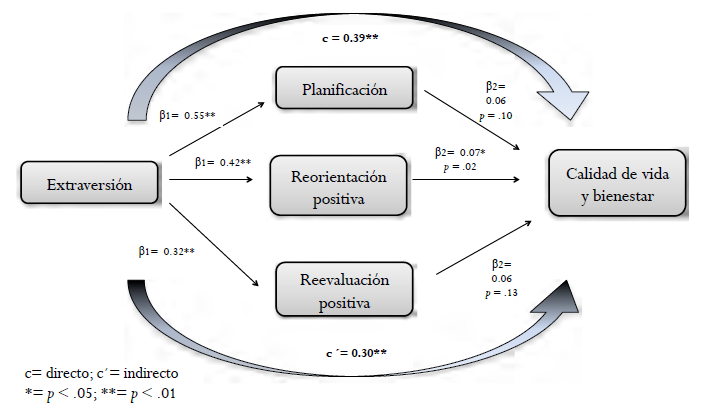 Si analizamos la Figura 2 (modelo M2-pag 128), observamos que presenta un patrón similar al modelo M1. Los efectos indirectos al primer mediador son todos significativos y son aquellos que parten de la variable de personalidad extraversión hacia las estrategias de regulación emocional en niños: planificación (β1 = .5556; p = . 0001); reorientación p ositiva ( β1 = . 4215; p = . 0002 y ; r eevaluación p ositiva ( β1 = . 3252; p = .0014). Los coeficientes de regresión de las estrategias de regulación emocional hacia la calidad de vida en niños son los siguientes: planificación (β2 = .0685; p = .1059); r eorientación p ositiva ( β2 = . 0778; p = . 0262 y ; reevaluación positiva (β2 = .0626; p = .1308), siendo significativa solamente la relación entre reorientación positiva y calidad de vida. Observamos una mediación parcial del efecto directo: c =.3950p = .0001; c’ = .3038 p = .0001.