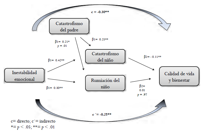 Con respecto al modelo M3, los efectos indirectos al primer mediador son todos significativos y son aquellos que parten de la variable de personalidad inestabilidad emocional hacia las estrategias de regulación emocional en niños: catastrofismo niño (β1 = .4222; p = .0001) y rumiación niño (β1 = .3090; p = .0001). La regresión de las estrategias de regulación emocional de los niños hacia la calidad de vida en niños aporta los siguientes coeficientes: catastrofismo (β2 = - .1165; p = .0014) y; rumiación (β2 = .0013; p = .9715), siendo significativa solamente la relación entre catastrofismo del niño y calidad de vida. Además, observamos que los índices de regresión del catastrofismo de los padres sobre las variables de regulación emocional del niño son: catastrofismo niño (β1 = .2503; p = .0057) y; rumiación niño (β1 = .2103; p = .0158). Observamos una mediación parcial del efecto directo: c = -.3085, p = .0001; c’ = -.2539,p = .0001. En dicha mediación, debemos considerar que el catastrofismo del padre se introduce como covariable controlada en el mediador.