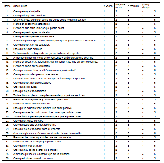 La versión utilizada en este estudio es una adaptación del cuestionario original Cognitive Emotion Regulation Questionnaire, CERQ (Garnefski et al., 2001; Garnefski, Kraaij, & Spinhoven, 2002), elaborada por Domínguez- Sánchez, Lasa- Aristu, Amor y Holgado- Tello (2011). Este cuestionario consta de 36 ítems está orientado a la valoración de las estrategias cognitivas de regulación emocional que utilizan las personas en respuesta a eventos estresantes o negativos en su vida. Estas estrategias se agrupan en las siguientes subescalas: a) planificación; b) aceptación; c) puesta en perspectiva; d) reorientación positiva; e) reevaluación positiva; f) autoculpa; g) rumiación; h) catastrofismo y; i) culpa de otros. Estos autores consideran las cinco primeras como estrategias adaptativas, y las cuatro últimas, desadaptativas.