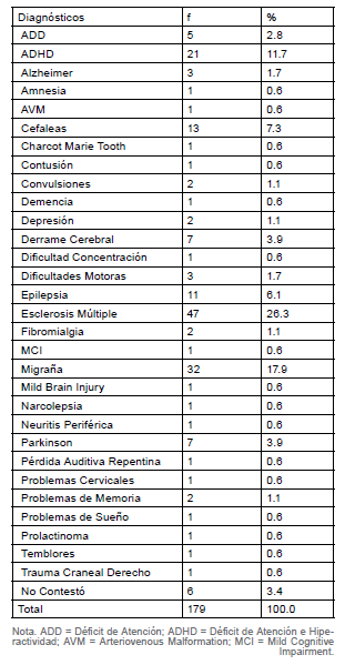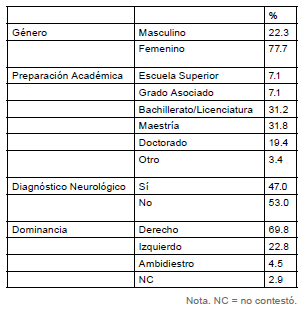 Realizamos un estudio transversal con una muestra por disponibilidad que estuvo compuesta por 411 participantes (véase Tabla 1). En este tipo de estudio se observan los fenómenos tal y como se dan en su contexto natural (Hernández-Sampieri, Fernández-Collado & Baptista-Lucio, 2010). La muestra está compuesta mayoritariamente por mujeres (77.7%). La mayoría de los participantes poseen un nivel educativo de licenciatura (31.2%). Las edades de los participantes oscilan entre 18 y 94 años (M = 40.07, DE = 15.76). El 47% de los participantes habían recibido un diagnóstico neurológico (véase Tabla 2). Se les preguntó a los participantes por su dominancia y la mayoría respondió que su dominancia era derecha (69.8%), seguido por izquierda (22.8%) y ambidiestra (4.5%). Un 2.9% no reportó dominancia.