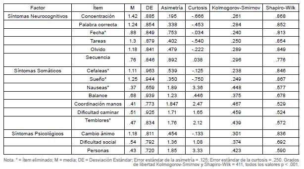Al analizar los resultados de la dimensión de síntomas neurocognitivos, se eliminó un (1) ítem (Olvido la fecha actual). De la dimensión de síntomas somáticos se eliminaron los siguientes cuatro (4) ítems: a) Sufro de dolores de cabeza, b) Tengo dificultades con el sueño, c) Sufro de nauseas, y d) Sufro de temblores en las manos. No obstante, los ítems de síntomas psicológicos se preservaron. Finalmente, de los cuatro (4) ítems de corte cualitativo para indicar la localización, al haberse eliminado los ítems a y d de los síntomas somáticos, los ítems dirigidos a identificar si dichos síntomas se experimentaban en el lado izquierdo, derecho o ambos, fueron descartados.