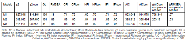 Para evaluar los resultados del análisis confirmatorio de factores utilizamos los índices de ajuste de los modelos de ecuaciones estructurales tales como: Chi-Cuadrado (χ2) y el Error Medio Cuadrático de Aproximación (Root Mean Square Error of Aproximation, RMSEA) (Byrne, 2010; Hu & Bentler, 1999). Valores menores a .08 para el RMSEA indican un ajuste aceptable, mientras que valores de .05 o menos indican un buen ajuste del modelo (Browne & Cudeck, 1993), así como índices de ajuste relativos (Marsh, Balla, & Hau, 1996): Índice de Ajuste Normativo (Normed Fit Index, NFI), Índice de Ajuste Comparativo (Comparative Fit Index, CFI), y el Índice de Ajuste Incremental (Incremental Fit Index, IFI). Cuando los índices de ajuste relativos tienen superiores a .90 son indicativos de un ajuste aceptable del modelo, mientras que valores de .95 o superiores indican un buen ajuste del modelo (Hu & Bentler, 1999). Para comparar los modelos no anidados con diferente número de parámetros de estimación, utilizamos el Akaike Information Criterion (AIC) (Akaike, 1987). Mientras menor sea el AIC, mejor es el ajuste del modelo estructural. Debido a que las puntuaciones de los ítems no seguían una distribución normal, utilizamos las correcciones de ajuste de modelos propuestas por Satorra y Bentler (2001), para los índices de Chi-Cuadrado, CFI, NFI, IFI y AIC.