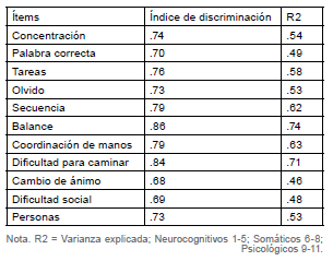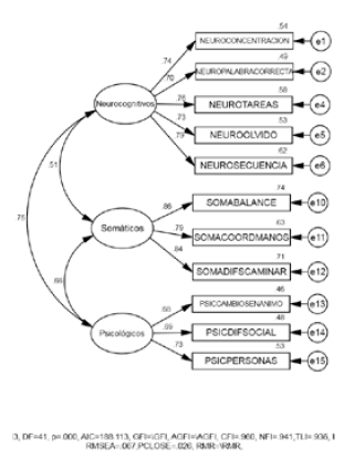 En la dimensión neurocognitiva, se preservaron los ítems que miden: a) concentración, b) problemas para encontrar la palabra correcta, c) dificultad para completar tareas, d) olvido de información reciente y e) dificultades para seguir la secuencia de actividades. En la dimensión somática, se mantuvieron los reactivos dirigidos a evaluar: a) problemas con el balance, b) dificultades con la coordinación de las manos y c) dificultades para caminar. Finalmente, en la dimensión psicológica se preservaron los res ítems originales, midiendo estos: a) cambio de ánimo, b) dificultades para interactuar con otras personas y c) las personas cercanas expresan cambios en la personalidad del paciente.