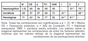 Examinamos la validez convergente y discriminante de la escala siguiendo el procedimiento propuesto por Fornell y Larcker (1981). En cuanto a la validez convergente calculamos la Varianza Media Extraída (VME) la cual indica la proporción de la varianza en los ítems que es explicada por el factor latente. Los valores de VME de todos los factores estuvieron por encima de .50 de lo recomendado por Fornell y Larcker (1981) (rango .52 - .73). En cuanto a la validez discriminante, los tres factores no comparten una cantidad sustancial de varianza entre sí. La varianza promedio compartida entre los factores es del .33 (rango .27 - .33). La varianza compartida entre dos factores de la escala siempre es menor a la varianza explicada por cada uno de los factores (VME), lo cual cumple con el criterio de validez discriminante propuesto por Fornell y Larcker (1981). Esto es indicativo de que cada una de las sub-escalas mide una dimensión distinta de síntomas neurológicos discretos sin que exista redundancia entre las sub-escalas del instrumento.