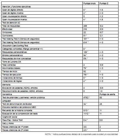 Previo a la evaluación de reconocimiento emocional, se realizó a la paciente una evaluación neuropsicológica que incluyó los siguientes dominios cognitivos: atención, funciones ejecutivas, memoria, lenguaje, visuoconstrucción y cognición social. El rendimiento de SF se comparó con los datos normativos correspondientes en cada caso (Tabla 1). Los resultados mostraron que la paciente tenía afectación de diversos dominios cognitivos incluyendo lentitud en la velocidad de procesamiento, disminución en la amplitud atencional auditiva, alteraciones de la memoria de trabajo auditivo-verbal y visuoespacial, compromiso moderado a severo de las funciones ejecutivas, alteración moderada del lenguaje, compromiso severo de la cognición social y falta de consciencia de sus dificultades.