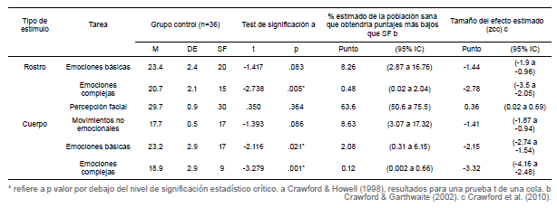 La paciente SF logró 60.7% de aciertos en el reconocimiento de expresiones corporales de emociones básicas y 37.5% de aciertos para las expresiones corporales de emociones complejas. El grupo control obtuvo en promedio 82.9% y 78.8% respectivamente en las mismas tareas. En comparación con el grupo control, SF tuvo menor cantidad de aciertos en las dos pruebas con expresiones corporales, tanto en el reconocimiento de emociones básicas (t = -2.116, p = .021, zcc = -2,145, IC 95% = -2.737 a -1.542) como complejas (t = -3.279, p = .001, zcc = -3.324, IC 95% = -4.162 a -2.479). El análisis del tamaño del efecto mostró que el rendimiento de SF estuvo por debajo de dos desviaciones estándar de la media del grupo control en la prueba de reconocimiento de expresiones corporales de emociones básicas, y por debajo de tres desviaciones estándar de la media para la prueba de expresiones corporales de emociones complejas.