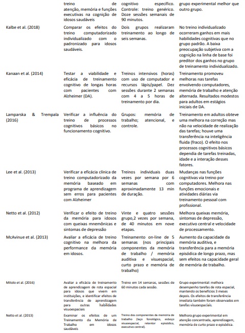 A efetividade do treino em memória para aprimorar a habilidade praticada, e transferir este aprendizado para outras capacidades também foi analisada no estudo de Zajac-Lambparska e Trempala (2016) e na investigação de Kanaan et al. (2014), que enfatizaram melhoras em aspectos atencionais. Os resultados indicaram que o treinamento da memória de trabalho aumenta a acurácia da memória e do controle atencional dos participantes, sem alterar a velocidade de processamento. Ocorreu um efeito fraco do treinamento no aumento dos escores de inteligência, sendo este efeito dependente da idade e da função treinada. O treino atencional foi mais eficaz para o grupo de adultos mais velhos (Zajac-Lambparska & Trempala, 2016). No estudo de Kanaan et al. (2014) os efeitos do treino da memória sobre os processos atencionais também foram seletivos. Já resultados positivos sobre a transferência de aprendizagem para habilidades motoras foram identificados no estudo de Chan et al. (2015).