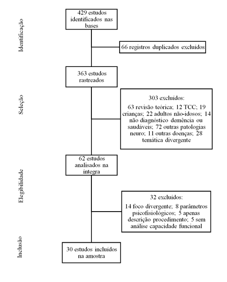 Foi realizado filtro inicial para exclusão de registros duplicados nas bases de dados. Dado o caráter variado dos elementos abordados nos estudos, na fase de seleção dos relatos optou-se por considerar os seguintes critérios de inclusão e exclusão na amostra, aplicados em leitura inicial dos resumos dos estudos previamente selecionados. Foram incluídos estudos com abrangência nas áreas das neurociências, psiquiatria, reabilitação, psicologia clínica, ciências comportamentais, psicologia experimental ou aplicada, ciências multidisciplinares em geriatria e reabilitação cognitiva. Foram excluídas publicações no formato de capítulo de livro ou monografia de final de curso; que tratassem exclusivamente de resultados clínicos sobre psicofármacos, neuroanatomia, neurofisiologia, modelagem computacional ou genética de transtornos neurocognitivos.