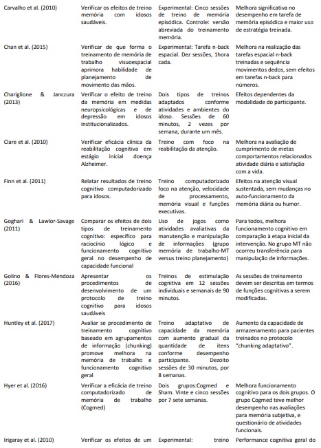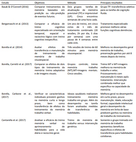 O estudo teve como objetivo analisar os efeitos do treinamento e reabilitação em memória de trabalho na mudança de parâmetros cognitivos e da capacidade funcional no envelhecimento saudável e nas demências. As pesquisas analisadas apresentaram um conjunto de dados valiosos que podem servir de guias tanto para profissionais aplicarem em suas rotinas de atendimento à população, quanto para nortear pesquisas sobre memória de trabalho e envelhecimento.