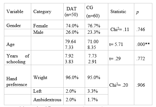 The sociodemographic characteristics of all the participants including DAT and CG groups are presented in table 1. There are no statistically significant differences between the two groups in terms of gender, years of schooling and hand preference (p> .05). There were differences in age (t(108)= 5.71, p< .001).