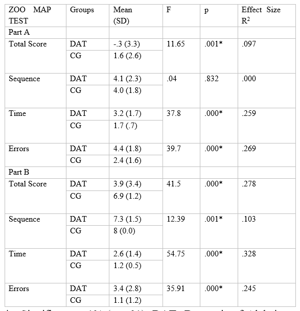 We found statistically significant differences (p< .01) between DAT patients with and CG with regards to total score, time and errors. The effect size was between moderate (total score) and large (time and errors). See Table 2. No differences were registered with regards to sequence.