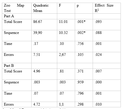 In the analysis of covariance, a significant effect of age on the total score and sequence (p < .01), along with a moderate size effect, was observed (Table 3).