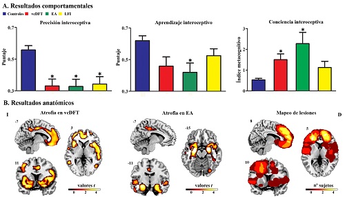 Finalmente, la conciencia interoceptiva también parece comprometer regiones extendidas asociadas con la auto-conciencia, el monitoreo de errores, la metacognición y la confianza. El desempeño en todos los grupos se asoció con el volumen de sustancia gris en las estructuras frontales (GFI, CCA) y temporales (HP, pHP, amígdala, giro temporal superior, PT). Más específicamente, la conciencia interoceptiva alterada en pacientes con vcDFT y EA se asocia con la corteza cingulada, prefrontal y fronto-temporal. Todas esas regiones se relacionan con la autoconciencia en ambas poblaciones y en sujetos control sanos (Shany-Ur et al., 2014) y con mecanismos de monitoreo de errores, que involucra a la CCA (Carter et al., 1998). Además, la conectividad funcional entre el GFI, HP y el pHP se asoció con la conciencia interoceptiva en todos los grupos. Las alteraciones de esta dimensión en ambas condiciones neurodegenerativas se asociaron con áreas frontales anormales COF-CPF y conectividad COF-HP alterada.