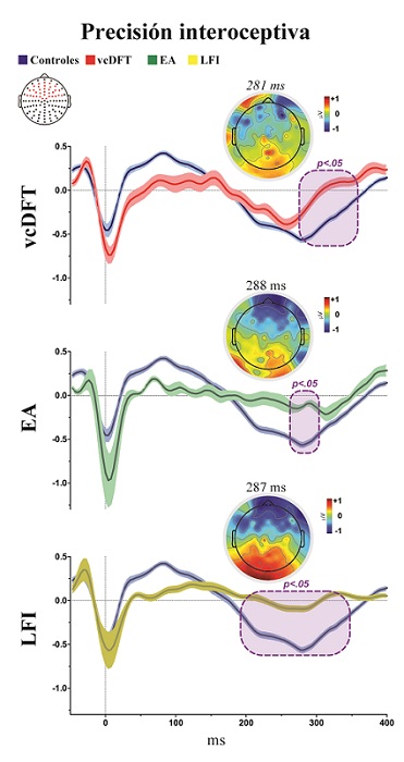 Mientras que los individuos realizaban el HBDT, se registraron las señales con un sistema Active-two de Biosemi de 128 canales a 1024 Hz y se les realizó un resampleo offline a 256 Hz. Se incluyeron dos electrodos adhesivos Ag/Ag-Cl en las posiciones del conductor II para registrar los datos del electroencefalograma (EEG). Los datos del EEG de 47 participantes (nueve con vcDFT, nueve con EA, nueve con LFI y 20 del grupo de control) cumplieron con los requisitos para un adecuado análisis de preprocesamiento (sin movimiento o artefactos fuertes, alta proporción señal-ruido y una tasa de rechazo de ensayos inferior al 30%). Sólo se informaron registros de la condición de precisión interoceptiva. Para revisar detalles sobre el preprocesamiento del EEG, consulte el material suplementario, sección 1.2.1.
