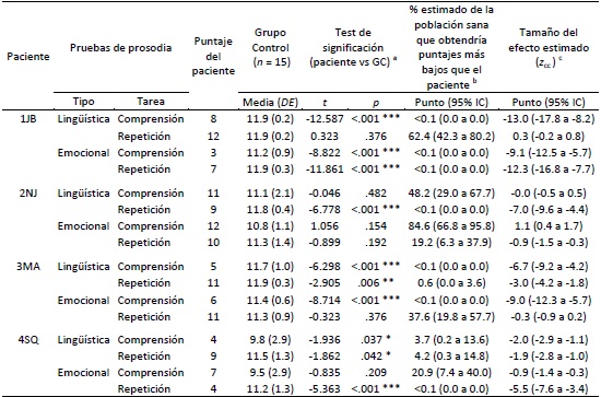 Las puntuaciones obtenidas por cada uno de los pacientes en las cuatro pruebas administradas, las medias y DE de los aciertos de los grupos control y los resultados de la comparación estadística entre pacientes y controles pueden observarse en la tabla 1. Respecto de la prueba de repetición de prosodia emocional, 2/4 pacientes (1JB y 4SQ) mostraron un rendimiento significativamente menor que su grupo control. Lo mismo sucedió en 2/4 pacientes (1JB y 3MA) en la prueba de prosodia emocional comprensión, 3/4 (pacientes 2NJ, 3MA y 4SQ) en la tarea de repetición de prosodia lingüística y 3/4 (pacientes 1JB, 3MA y 4SQ) en la de comprensión de prosodia lingüística.