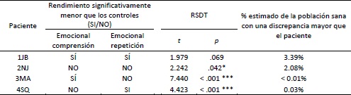 El rendimiento de la paciente 3MA fue estadísticamente menor que el de los controles en la prueba de comprensión emocional, y su rendimiento estuvo por debajo de 9 DE de la media del grupo control. Por otro lado, el rendimiento del paciente 4SQ fue estadísticamente menor que el de los controles en la prueba de repetición de prosodia emocional, y su rendimiento estuvo por debajo de 1.9 DE de la media del grupo control. Ambos pacientes cumplen, entonces, con el criterio 1 de disociación clásica. Ninguno de los dos presentó diferencias significativas en la otra de las tareas (cumpliendo con el criterio 2 de disociación clásica). Respecto de los resultados de la prueba RSDT (tabla 2), en ambos pacientes se observó una discrepancia mayor entre las tareas emocionales a la discrepancia observada en el grupo control entre las mismas (cumpliendo con el criterio 3). Además, se estimó que menos del 0.01% de la población sana presentaría una discrepancia mayor a la observada en la paciente 3MA entre las tareas, y que solo el 0.03% de la población sana mostraría la diferencia observada en el paciente 4SQ.