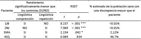 En cambio, el rendimiento del paciente 4SQ en la tarea de comprensión estuvo por debajo de 2 DE y, para la tarea de repetición, a 1.9 DE por debajo de la media. Los resultados del RSDT (tabla 3) mostraron que la diferencia entre esas tareas no fue estadísticamente significativa a la diferencia que se observa en los controles, por lo que no puede establecerse una disociación fuerte en este paciente.