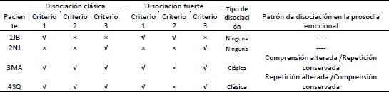 Respecto de las tareas de prosodia emocional (tabla 4), se observaron dos patrones de disociación clásica: la paciente 3MA tuvo rendimiento alterado para el reconocimiento pero no para la expresión, mientras que el paciente 4SQ presentó el rendimiento opuesto. Las evidencias aportadas por estos dos casos revelan, en su conjunto, una disociación doble entre la capacidad para reconocer y expresar prosodia emocional.