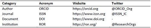 Finally, the Research Organization Registry Community (ROR) is probably the least known acronym, given that it was only in 2016 that it was decided to create an organisation ID. A steering group composed of California Digital Library, Crossref, DataCite and Digital Science was in charge of implementing the pilot in 2018 (ROR, 2019) and it went on to become the missing piece of infrastructure around achieving research organisation identifiers and their associated metadata.