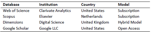An enormous number of databases exist for the search and dissemination of scientific information, so it is impossible to mention them all in this brief editorial. It was thus decided to present just four of them, two of closed access, one with a hybrid model and one of open access (see Table 2). There is consensus that Web of Science (WoS) by Clarivate Analytics and Scopus by Elsevier are the main databases worldwide. Both are paid databases that require subscription. Additionally, both have an open access platform that provides additional data on the journals indexed in their catalogue. In the case of WoS, it incorporates the Master Journal List (https://mjl.clarivate.com/home), which provides information about the journal’s website, frequency and presence in the different citation indexes of the WoS Core Collection (Science Citation Index Expanded, Social Sciences Citation Index, Arts & Humanities Citation Index and Emerging Sources Citation Index)
