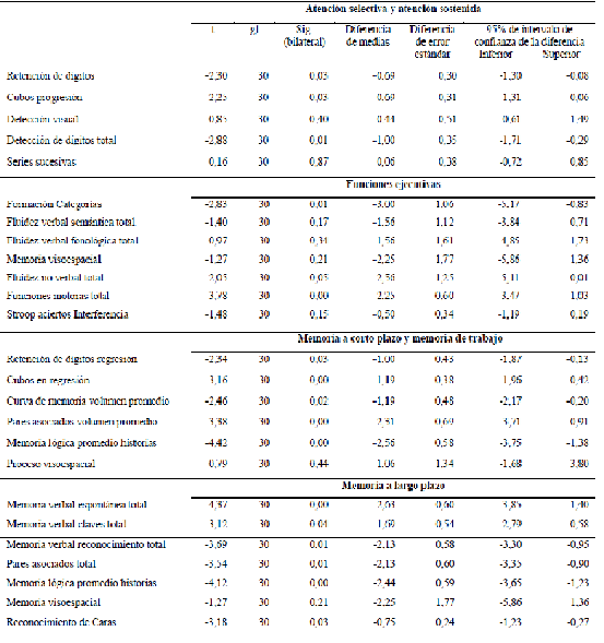 Se encontraron diferencias estadísticamente significativas respecto al rendimiento en la atención, memoria y funciones ejecutivas. Tomando en cuenta el protocolo de calificación del test NEUROPSI, las diferencias encontradas en el área de atención y concentración incluye las funciones: atención selectiva, atención sostenida, y control atencional que tiene relación con la planificación, flexibilidad mental y control inhibitorio. Las diferencias encontradas en el área de memoria implican a la memoria a corto plazo, memoria de trabajo y memoria a largo plazo.