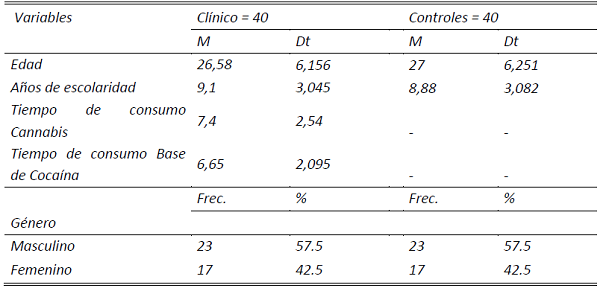 La muestra total estaba compuesta por 80 individuos, 40 en el grupo clínico y 40 en el grupo control. El grupo clínico lo componían individuos con historial de drogodependencia provenientes de dos centros –CRADUN y CREIFAV– de tratamiento de adicciones ubicados en la ciudad del Puyo, los criterios de inclusión fueron: 1) historial de ingreso de uno a tres internamientos; 2) edades comprendidas entre 20 a 40 años; 3) una escolaridad de 6 a 18 años y, 4) con un tiempo de consumo habitual de cannabis y cocaína de 5 a 15 años. Por otra parte, los criterios del grupo control fueron: 1) pertenecer a la ciudad del Puyo; 2) tener un rango de edad entre 20 y 40 años; 3) una escolaridad de entre 6 a 18 años y, 4) sin antecedentes de consumo de sustancias.