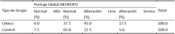 Al comparar ambos grupos según la puntuación global del Neuropsi, se encontró diferencias significativas en la escala diagnóstica. El nivel normal alto no reportó ningún valor para el grupo clínico, pero sí para el grupo control con 7,5%, es interesante porque a pesar de la similitud de los grupos, no se reporta un solo caso en el clínico, ni siquiera entre los de menor tiempo de consumo. Sin embargo, con mayor incidencia para la afectación de la memoria se encuentra el nivel de alteración leve del 45.0% en el grupo clínico y 22.5% en el control (ver tabla II).