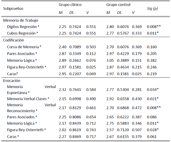 Resultados: El grupo clínico en relación al control puntúa más bajo en la memoria sensorial, memoria a corto plazo, memoria de trabajo, con afectación de la curva de aprendizaje, fallos en la integración de información semántica.