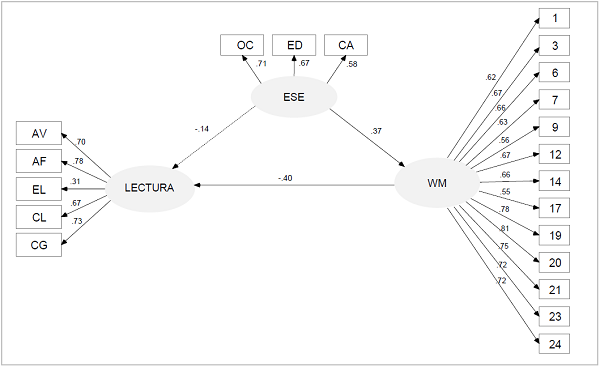 Para analizar la relación entre el ESE, las FE y las competencias lectoras se pusieron a prueba diferentes modelos (Tabla 6). En primer lugar, se examinó qué FE específicas predicen las competencias lectoras en niños. El modelo 5 (M5), que analiza la contribución de la MT y la inhibición a las competencias lectoras, no mostró un ajuste satisfactorio a los datos empíricos siendo la MT el único un predictor significativo (. = -.40). Por tal motivo, se puso a prueba el Modelo 6 (M6) con el objetivo de analizar la contribución de la MT a las competencias lectoras (. = -.45). Este modelo mostró un buen ajuste a los datos empíricos lo que sugiere que, de los indicadores comportamentales ejecutivos, solo la MT es un predictor de las competencias lectoras. El modelo 7 (M7) que analiza los efectos directos del ESE sobre la MT (β = .42) y del ESE sobre las competencias lectoras (β = -.36) mostró un ajuste satisfactorio lo que indica que el ESE predice estas habilidades. Finalmente, el Modelo 8 (M8) que analiza los efectos directos del ESE sobre las competencias lectoras (β = -.14, ns) e indirectos a través de la MT mostró un mejor ajuste que el modelo 7 (ver Tabla 6 y Figura 2). Estos datos sugieren que el efecto del ESE sobre las competencias lectoras estaría mediado por la MT.