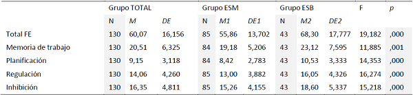 Para analizar el efecto del estrato socioeconómico sobre las FE se empleó MANOVA. Se halló un efecto significativo general de la variable nivel de estrato socioeconómico, F de Hotelling(4,123) =4,919, . = .001, n . =0,138, sobre las FE total como en sus distintas dimensiones. En la tabla 1 se presentan los valores medios y desvíos de los indicadores totales y de cada índice de FE obtenidos para el grupo total y según el ESE. Puede observarse que la media de la escala total y de las 4 subescalas es mayor en el grupo ESB, indicador de menor funcionamiento ejecutivo (ver tabla1).