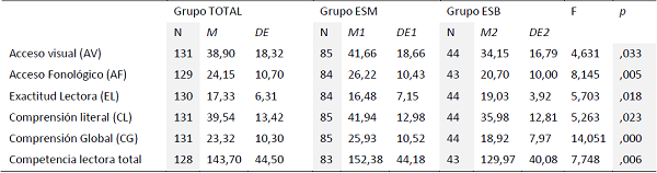 Para analizar el efecto del estrato socioeconómico sobre la competencia lectora se empleó MANOVA. Se halló un efecto significativo general de la variable nivel de estrato socioeconómico, F de Hotelling(6, 119) =5,487 p <.001, n . =0,217. En la tabla 2 se presentan los valores medios y desvíos de los indicadores de cada índice de la CL, así como de los totales de la misma, para el grupo total y según el ESE. Los resultados indican diferencias significativas según el ESE (. < .05) tanto en CL total como en los indicadores acceso visual, acceso fonológico, comprensión literal y comprensión global. El grupo de niños pertenecientes a ESM mostró mejor desempeño, que el grupo de ESB en todos los indicadores a excepción de la variable exactitud lectora (ver tabla 2).