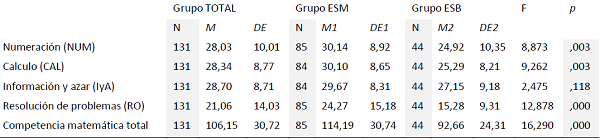 Para analizar el efecto del nivel de estrato socioeconómico sobre la competencia matemática y para cada índice se empleó MANOVA. Se halló un efecto significativo general de la variable nivel de estrato socioeconómico, F de Hotelling(4, 124) =4,222, p =.003, np2 =,120. La tabla 3 presenta los valores medios y desvíos de los indicadores de cada índice de la CM, así como del total de la misma, para el grupo total y según el ESE. Los resultados indican que existen diferencias estadísticamente significativas (p < .05) entre los grupos de sujetos comparados en la competencia total y en los indicadores numeración, calculo, y resolución de problemas, diferencias no significativas (p=.118) en información y azar. En todos los casos el grupo de niños pertenecientes a ESM obtuvo mejor desempeño que el grupo de niños ESB (Ver tabla 3)