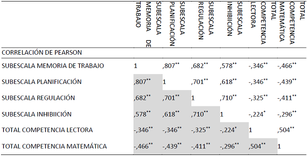 Para analizar la relación entre las variables se empleó correlación bivariada de Pearson. Se hallaron asociaciones estadísticamente significativas con carácter de (a) muy alta (r > 0.80) o alta (r = 0.60 a 0.80), entre las distintas sub-escalas de funciones ejecutivas; (b) alta (r = 0.60 a 0.80) entre el rendimiento escolar en lengua y en matemática; (c) moderada (r = 0.40 a 0.60) entre el total competencia matemática y las sub escalas memoria de trabajo, planificación y regulación; y (d) baja (r = 0.20 a 0.40) entre el total de competencia matemática y la subescala inhibición así como entre la competencia lectora y las subescalas memoria de trabajo, planificación, regulación e inhibición (Véase Tabla 4).