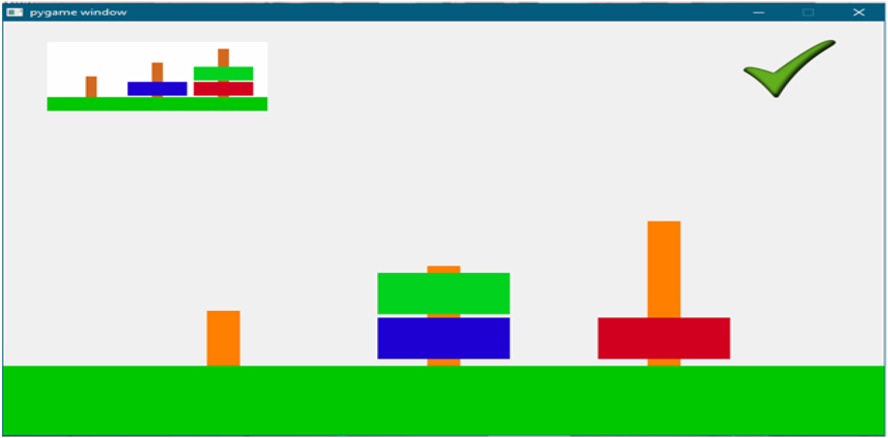 Tarea de planificación (Torre de Londres -ToL-). Se utilizó una variación de la tarea desarrollada por Shallice (1982). En cada ensayo se presentaron en la pantalla dos modelos que tenían una base con tres varillas de altura creciente, en las cuales se insertaban tres rectángulos de distintos colores (rojo, azul y verde) (Figura 1). En la primera varilla (izquierda) entraba un solo rectángulo, en la del medio dos y en la última, tres. Uno de los modelos (ubicado en el margen superior izquierdo de la pantalla) presentaba una configuración de los rectángulos en sus varillas, que se mostraba como el modelo a alcanzar en cada ensayo (modelo final). El otro modelo, ubicado en el centro de la pantalla, fue aquel en el cual las niñas y los niños podían mover los rectángulos de una varilla y ponerla en alguna de las otras dos, y cuya configuración inicial difería de la del modelo final. La configuración de ambos modelos cambiaba en cada ensayo. La consigna dada a las niñas y los niños consistió en igualar los modelos a partir de mover los rectángulos del modelo inicial. Para ello, solo era posible mover un rectángulo por vez, y debían hacerlo en una cantidad mínima de movimientos (ambas reglas se señalaban durante la consigna). Un ensayo correcto era aquel en el que se logra alcanzar la configuración del modelo final realizando una cantidad de movimientos mínimos.