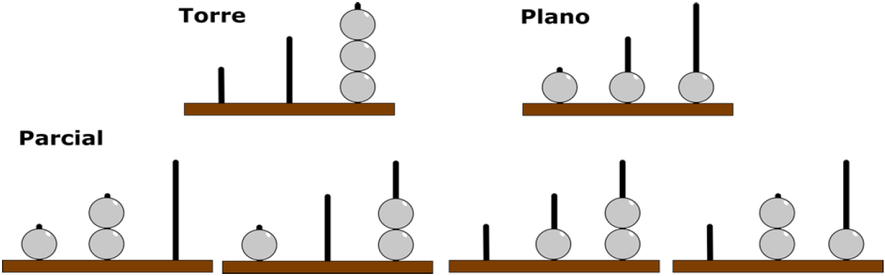 Los modelos finales podían presentar tres posibles configuraciones de acuerdo con la ubicación de los rectángulos en las varillas: torre, plano y parcial (Figura 2). En la configuración torre, al resolver la tarea los rectángulos quedan todos en la misma varilla; en la configuración tipo plano, queda un rectángulo en cada varilla; y en el parcial quedan dos rectángulos en una varilla y uno en otra de las varillas. Como consecuencia de variar los ensayos en función de la configuración del modelo final (torre, plano y parcial), se terminaban presentando distintos niveles de dificultad (Kaller et al. 2004; 2012; 2016). En total, de los 33 ensayos de la tarea (sin contar los primeros 4 de práctica), en 7 la configuración del modelo final era torre, en 6 era plana, y en 20 parcial. Para evaluar el desempeño en esta tarea, las variables consideradas fueron: cantidad de ensayos correctos realizados, es decir los ensayos en los que la niña o el niño lograron igualar la configuración final en la cantidad de movimientos mínimos; y proporción de ensayos correctos según el tipo de configuración, para analizar el desempeño en cada configuración.