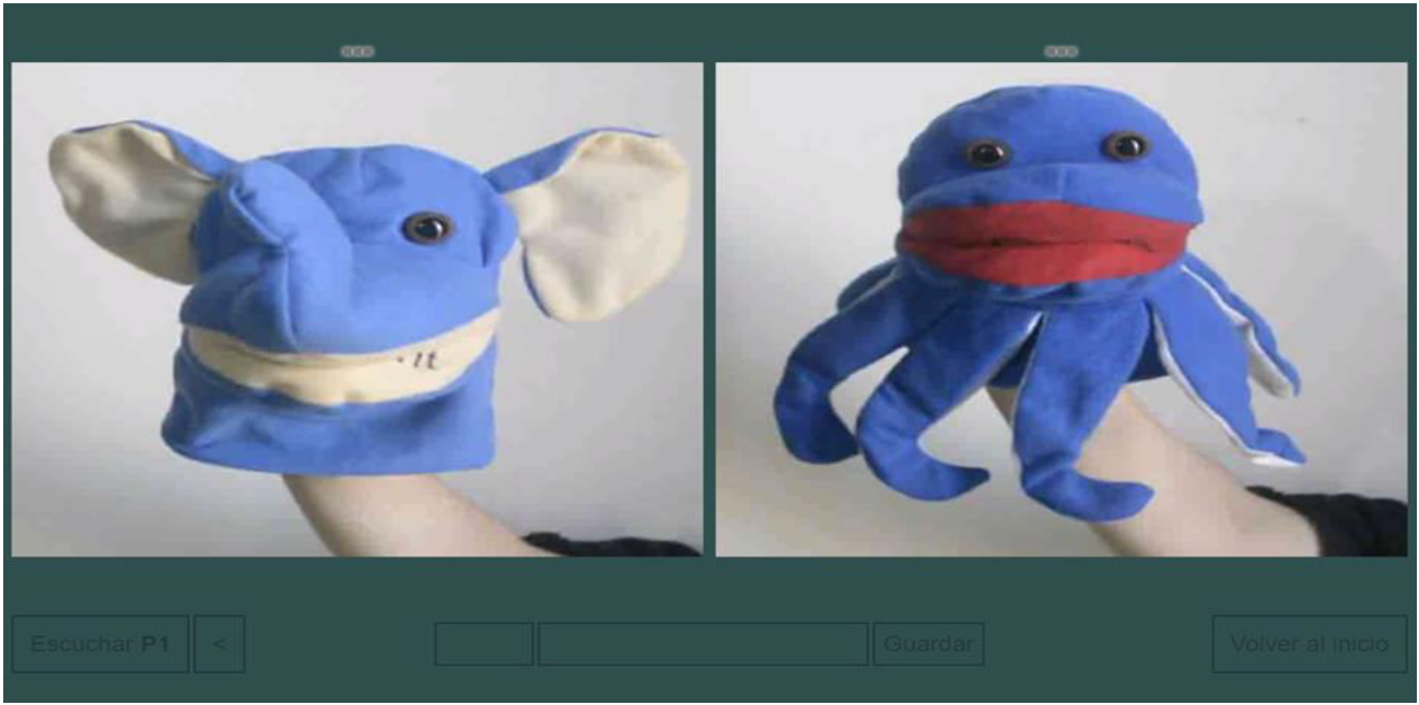 Reporte de la motivación. Para evaluar la motivación de las niñas y los niños sobre la tarea de planificación se utilizó una modificación de la escala Entrevista de títeres sobre escalas de competencia y disfrute de la ciencia (Puppet Interview of Competence in and Enjoyment of Science –PISCES-), utilizada previamente en grupos de niñas y niños (Kim et al., 2017; Mantzicopoulos, Patrick, & Samarapungavan, 2008). Para obtener este reporte se desarrolló un programa donde se observaban videos (20 en total, dos por cada ítem de la tarea) en los que aparecen dos títeres que hablan (Figura 3). En los videos, cada uno de los títeres hacía una afirmación, opuestas entre sí (ítems dicotómicos). Una vez presentado cada video se le pedía a la niña o el niño que eligiera el títere que opinaba lo mismo que ella o él (Mancini, Segretin, & Ruetti, en prensa). Los videos se reproducían de manera consecutiva y la duración de cada uno era de 2 segundos aproximadamente. El primer video se proponía a modo de ejemplo para verificar que se comprendiera la consigna. En el mismo las niñas y los niños escuchaban las siguientes dos afirmaciones: Me gusta/No me gusta la pizza, y Me gusta/No me gusta jugar en la juegoteca. Luego, para medir la percepción de competencia o habilidad, se utilizaban otras 4 afirmaciones: “Juegos como este son fáciles/difíciles”; “sé/ no sé cómo hacer juegos como este”; “puedo/ no puedo hacer juegos como este”; y “soy buena-o/no soy buena-o en juegos como este”. Finalmente, para evaluar el valor intrínseco hacia la tarea, se incluían las siguientes afirmaciones: “me gusta/no me gusta jugar juegos como este”; “me divierto/no me divierto jugando juegos como este”; “quiero/no quiero saber más sobre este juego”; y “me siento feliz/no me siento feliz cuando juego cosas como esta”. Los ítems, positivos y negativos, estaban contrabalanceados tanto según el títere que los decía, como por la posición del títere (derecha o izquierda). Las variables consideradas en este estudio fueron la habilidad percibida y el valor intrínseco, puntuando cada ítem cuando se elegía la afirmación positiva (correspondiente con un mayor nivel motivacional). Cada variable podía tomar valores en una escala de 0 a 4.