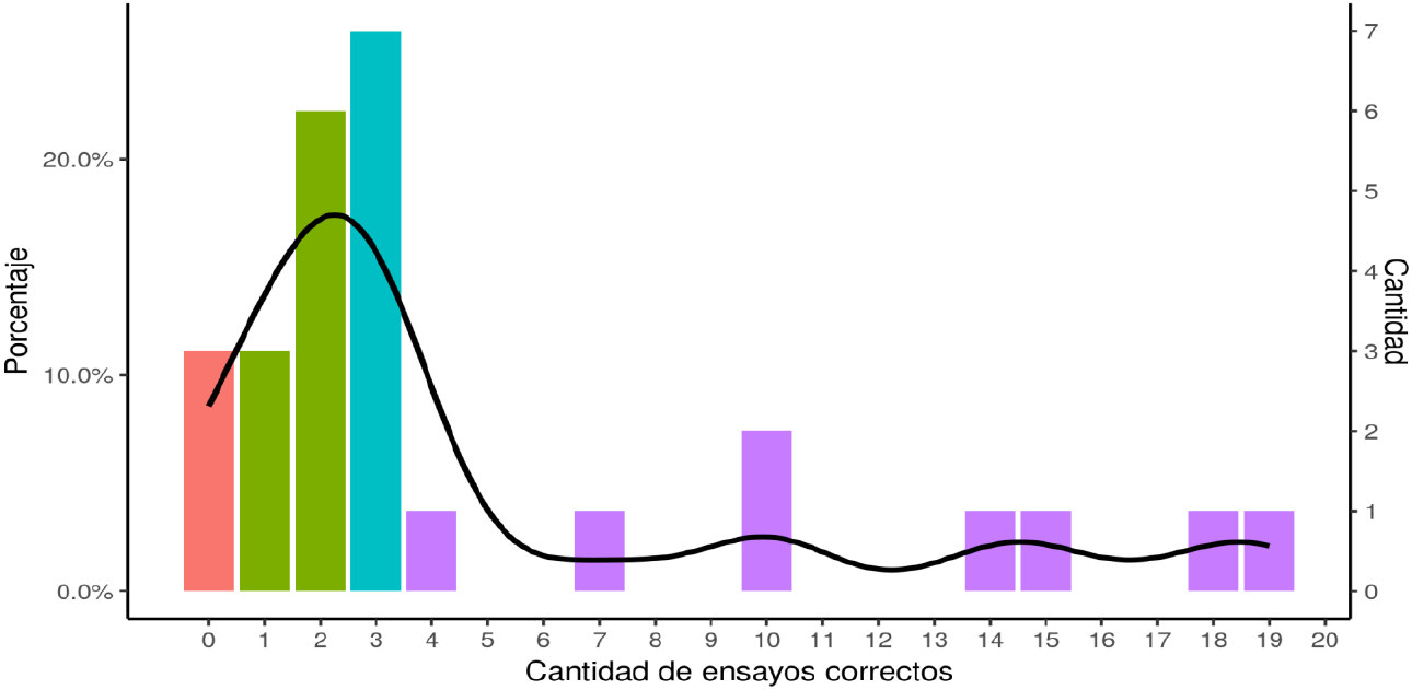 En la Figura 4, se observan las distribuciones de casos según la cantidad de ensayos correctos (M = 4.93; DS = 5.57). En total, las niñas y los niños tuvieron entre 0 y 19 ensayos correctos.