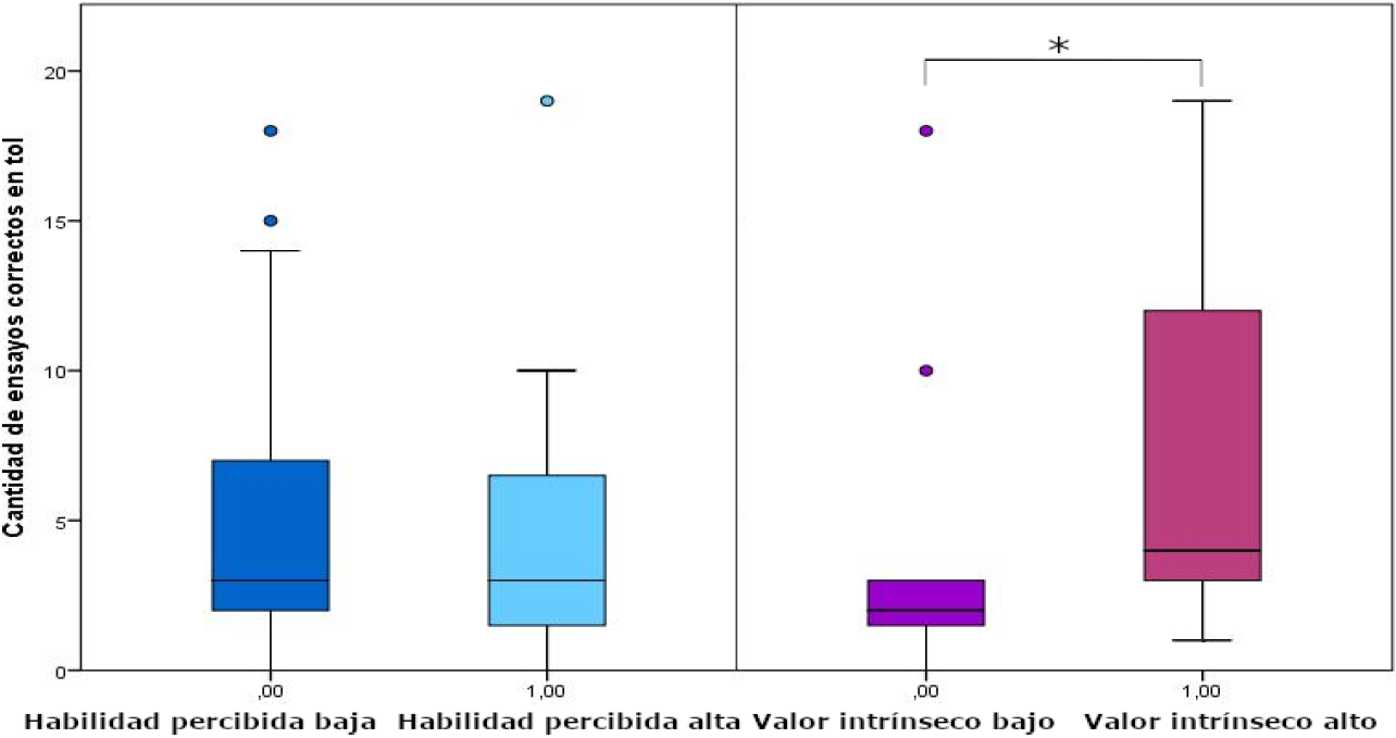 Dado que se encontró que la muestra en la variable cantidad de ensayos correctos en la tarea ToL, no presenta una distribución normal (p = .001), en los siguientes análisis se optó por pruebas no paramétricas. Al analizar el desempeño en ToL en función de los grupos de motivación alta y baja de cada dimensión (Figura 5), no se encontraron diferencias en la cantidad de ensayos correctos entre los grupos de habilidad percibida alta y baja (Z = -.028; p = .978). En cambio, se encontraron diferencias en la cantidad de ensayos correctos entre los grupos de valor intrínseco alto y bajo (Z = -2.107; p = .035). Como puede observarse en la Figura 5, el 50% de las niñas y los niños con valor intrínseco alto presentaron más de 5 ensayos correctos en ToL, mientras que el total (exceptuando dos valores atípicos) con valor intrínseco bajo, presentaron menos de 5 ensayos correctos. Es decir, las niñas y los niños con alto valor intrínseco presentaron mayor desempeño en ToL.
