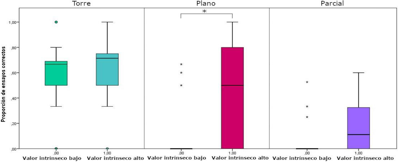 Al comparar la proporción de ensayos correctos en cada configuración posible del modelo final (torre, plano y parcial) según baja y alta habilidad percibida, no se encontraron diferencias en los ensayos de torre (Z = -.425; p = .671) ni plano (Z = -.095; p = .924) y parcial (Z = -.131; p = .896). Al comparar según bajo y alto valor intrínseco, no se encontraron diferencias (Z = -1.060; p = .289) en la proporción de ensayos correctos de torre entre niñas y niños con valor intrínseco alto (Md = 15.32) y bajo (Md = 12.17) (Figura 6, izquierda). Para los ensayos de plano, se encontraron diferencias (Z = -2.216; p = .028) entre niñas y niños con valor intrínseco alto (Md = 16.86) y bajo (Md = 11.03). Por último, no se encontraron diferencias en los ensayos de parcial (Z = -1.712; p = .087) entre niñas y niños con valor intrínseco alto (Md = 16.05) y bajo (Md = 11.63).