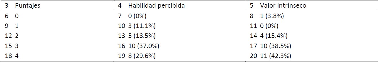 En las dos dimensiones de la motivación analizadas, las niñas y los niños tendieron a presentar valores altos (valor intrínseco: M = 3.15, DS = .97; habilidad percibida: M = 2.88, DS = .99). En la Tabla 1 se presenta la distribución de frecuencias de ambas dimensiones.