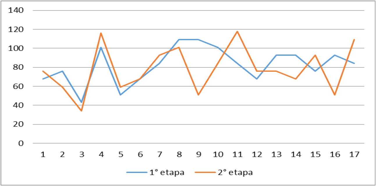 En la Figura 2 se puede apreciar una comparación en un gráfico de líneas entre los niños del grupo control en las dos etapas, con la media de 100 de la batería BANPE. En la misma se observa caso por caso el desempeño en el sub-test de Planificación.