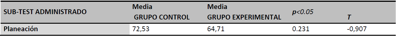 Los resultados de la comparación inter-grupal mostraron que no hubo diferencias significativas en la evaluación correspondiente a la fase de pre-prueba. Esto sugiere que al inicio de la investigación no existían diferencias estadísticamente significativas en el nivel de desarrollo neuropsicológico de ambos grupos y que se encontraban homogéneos. En este sentido, los resultados de la comparación pretest-postest evidenciaron diferencias significativas (P<.001) a favor del grupo experimental a través del programa implementado, donde se favoreció el desarrollo de la función ejecutiva de planeación.