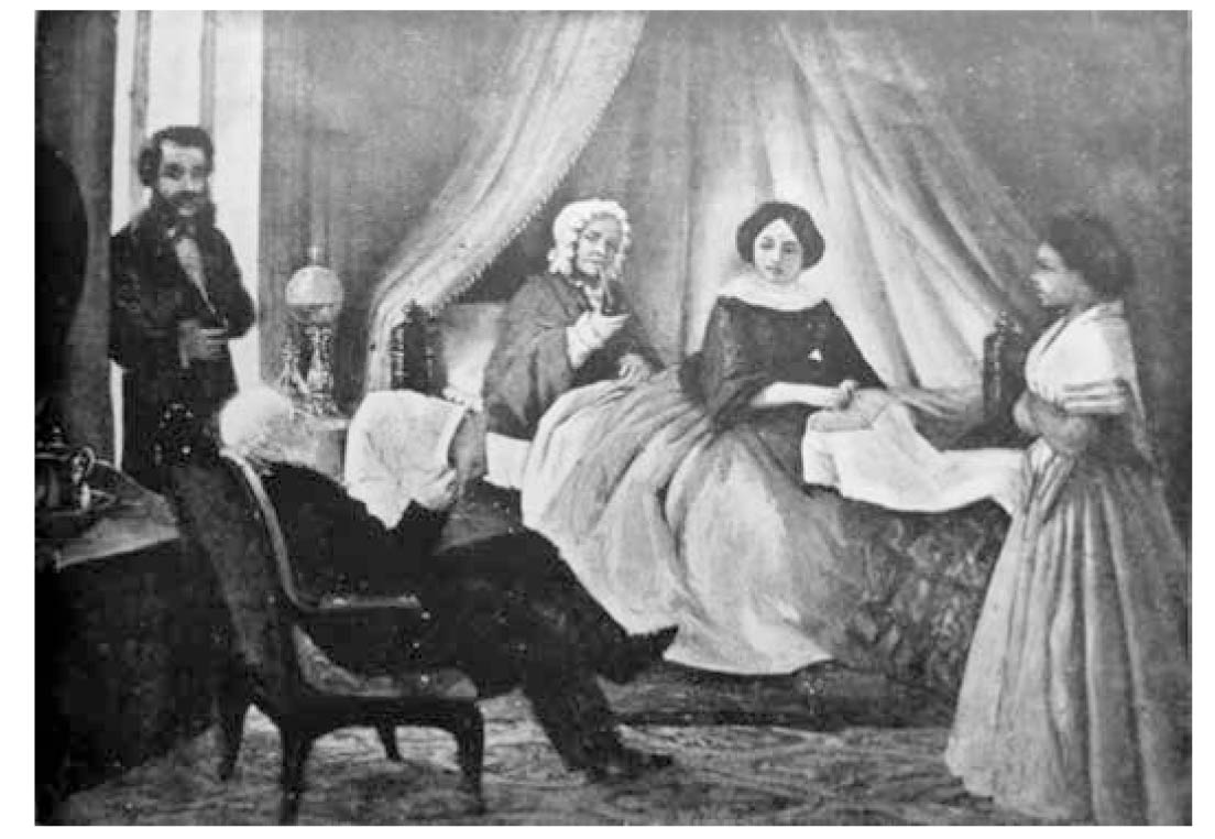 Imaginemos que estamos ante un cuadro costumbrista de mediados del siglo XIX, que tiene por asunto principal el motivo de la lectura en voz alta, compartida, en un ambiente familiar donde predominan las mujeres. Sería así: un hombre entrado en años yace cómodamente apoyado en un sillón francés mullido, las piernas cruzadas, la nuca descansando sobre el respaldo, el periódico abierto, ligeramente arrugado entre las manos. A su izquierda, otro caballero más joven lo contempla mientras toma un mate, está reclinado sobre el perfil de una ventana alta por la que se filtra la luz matinal que riega el interior de una acogedora habitación burguesa donde transcurre la escena. De derecha a izquierda, terminando casi en lrente del lector, se suceden en posiciones diversas tres mujeres: una criada negra que aguarda órdenes, una joven bonita que yace sentada, bordando, sobre una gran cama estilo imperial donde su madre (o quizá su abuela) se encuentra recostada y arropada, saboreando también ella un mate, mientras escucha y observa, a su vez, al hombre que lee para ellas en voz alta. Sobre la cama caen los velos de un rico cortinado; sobre el piso se despliega una mullida alfombra recamada; sobre las mesitas que coronan la habitación hay un jarrón de agua para acicalarse y, por supuesto, una lámpara a vela que servirá para iluminar la estancia cuando caiga la noche.