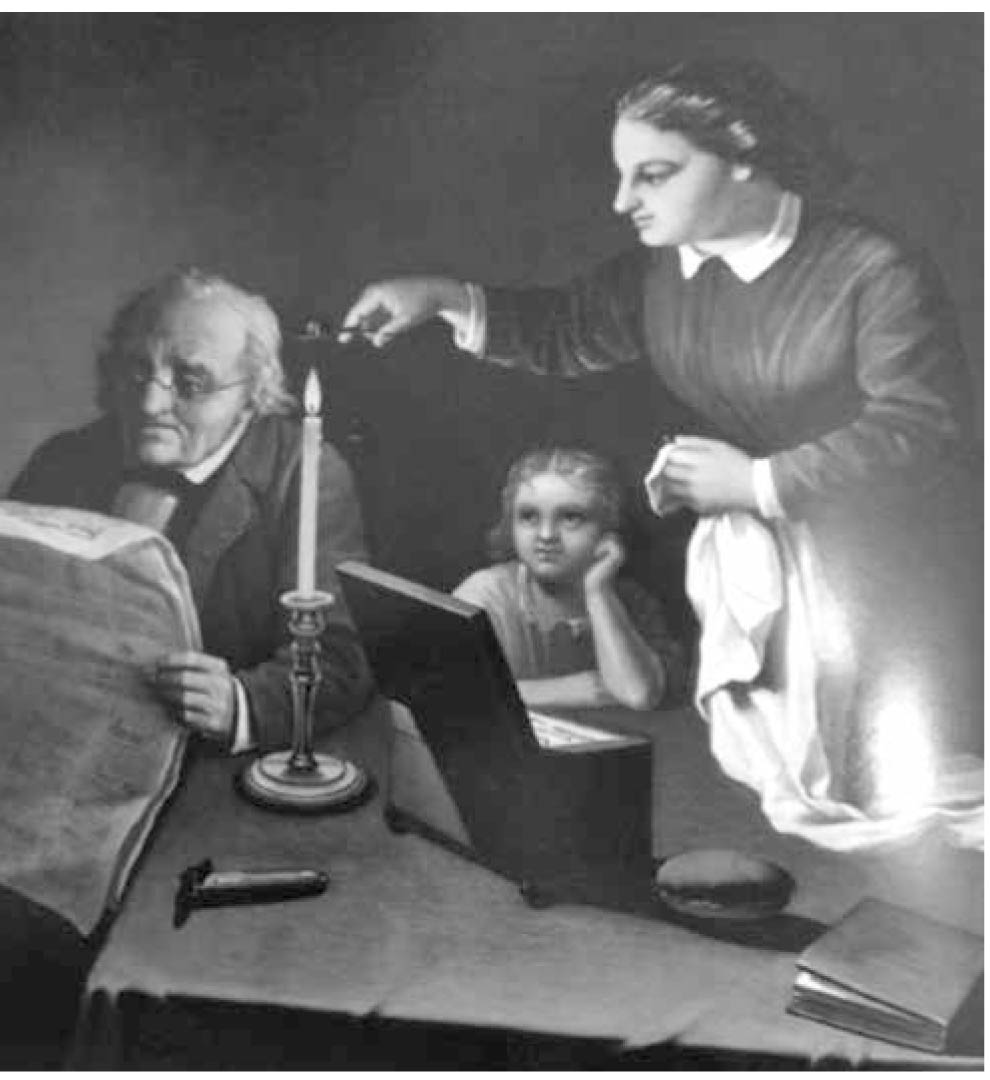 Claro que estamos en la casa de una familia burguesa, probablemente de una familia de la élite porteña de mediados de siglo. Así que la perspectiva de Pueyrredón no es original, sino que busca su acierto en los ideales de un sector social y de una época. Por eso no sorprende que algo de lo que encontramos en ese retrato familiar se reitere, bajo una clave diferente, en otro lienzo de Benjamín Franklyn Rawson, pintado en 1867, titulado Escena interior. De nuevo tenemos allí a una joven escoltando a un lector. ¿Se trata de una criada o de una muchacha de familia? No hay otras mujeres adultas en la escena; tan solo una niña que acompaña, un poco atrás del hombre, y que parece estar ajena a la lectura que él practica en silencio (al igual que la joven aunque por razones diversas: no es tan solo la clase social o el género, sino también la edad, lo que la deja a la niña fuera de la situación de lectura del periódico). El hombre esta vez no lee en voz alta, sino que lo hace para sí. La lectura es aquí el goce, ¿el lujo?, de un señor burgués que mientras lee y se ilustra, es bien servido en sus necesidades de hombre de mundo: la joven se ocupa de acondicionar el ambiente para que él pueda leer. Ella sujeta en sus manos un pabilo con el que acaba de encender la vela que ilumina la escena mientras él, insisto, lee cómodamente el diario. Antes o después lo aguarda también la lectura de un libro; eso sugiere la presencia de un volumen cerrado en la esquina de la mesa.