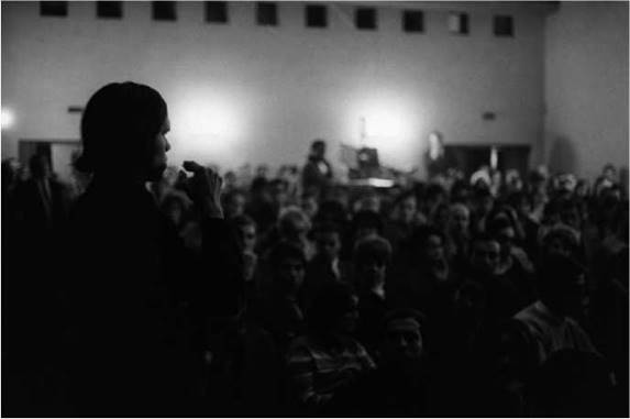 Foto: Marcelo Montealegre.Esta foto de Marcelo Montealegre sugiere la intensidad de las discusiones que suscitó la proyección de la película experimental de Jaime Barrios,[1]Homenaje a Nicanor Parra, en la Cineteca de la Universidad de Chile en 1968.[2] El estreno chileno de este filme de 44 minutos -realizado unos meses antes, durante una memorable visita de Parra a Nueva York- tuvo cierta resonancia pública en Santiago, a juzgar por las reseñas del polémico filme en la prensa (Ver Gilroy; “Film protagonizado...”; “Otra muestra...”; “Pesadilla con artefactos poéticos.”).[3] La pinta del “joven productor de cine llamado ‘underground'” (según lo describe uno de los reseñistas) no pasó desapercibida: el pelo largo, los “lentes de hippie” y otras insignias del desenfado iconoclasta de un realizador identificado con los estilos de vida del ambiente contracultural neoyorquino y las formas nuevas, no-partidistas, de un activismo radical.