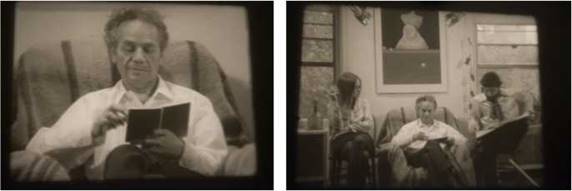 Fotos: Marcelo Montealegre.El plano medio de la lectura y de la conversación entrecortada por momentos simula o parodia un encuadre convencional televisivo del género- entrevista, lo que indica la acción mediática del filme. Para tener una mejor idea de la deriva mediática del encuadre, vale la pena notar que hacia esos mismos años surgen los primeros “talk shows” en la TV, género que evidencia una temprana curiosidad comercial ante la excentricidad pintoresca de algunos componentes del underground en “talk shows” como los de Merv Griffin, por ejemplo, quien había entrevistado a Warhol en 1965 y a Ginsberg en 1967. Las variaciones de ángulo o apertura de los encuadres son mínimas, aunque a veces abruptas, sin transiciones elaboradas, según también comprobamos en el corte a la segunda secuencia de la película, donde Barrios instala la Bolex en el interior de una fiesta roquera y sicodélica que incluye a los participantes de la entrevista inicial, incluido el propio cineasta, Barrios, quien también aparece festejando en escena.