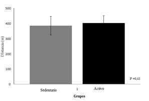 En la primera figura se presenta el promedio con desviación estándar para cada grupo evaluado. La diferencia en metros encontrada fue solamente de 17,08 m entre un grupo y el otro. Lo que no representa una diferencia estadísticamente significativa.