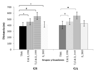 Las diferencias encontradas, presentadas en la figura 2, representan la comparación intra grupos con tres ecuaciones diferentes. Los símbolos representan las diferencias entre la medida del test de los seis minutos medido en el presente estudio y las diferentes ecuaciones. El asterisco representa la diferencia con la ecuación de Enright & Sherrill, 1998 para el grupo de sedentarios (P < 0,001), y las dos cruces para la misma situación para el grupo de activos (P = 0,001); El numeral representa diferencia con la ecuación de Troosters, et al., 1999 para el grupo de sedentarios (P < 0,001), y el círculo negro para la misma situación para el grupo de activos (P < 0,001); La cruz representa la diferencia con la ecuación de Enright, 2003 para el grupo de sedentarios (P = 0,002).